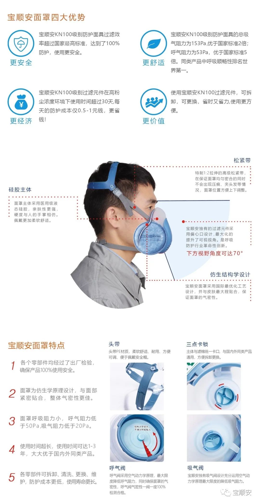 防护领域的各个厂商,对于人体工程学的理解也不同。宝顺安的面罩主体,在人体工程学的支持下,加入了对于亚洲人面部的数据调查,设计出的面罩对于亚洲人面部更加贴合,也使面罩拥有更好的密封性。宝顺安面罩的泄漏率低于0.6%(国标标准2%),大大提高了防护能力。